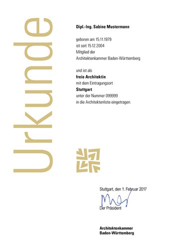 Nachweis einer praktischen Tätigkeit von mindestens zehn Jahren im Aufgabenbereich der Fachrichtung bei einem in die Architektenliste dieser Fachrichtung eingetragenen Architekten oder Stadtplaner. Außerdem müssen Kenntnisse nachgewiesen werden, die einem mit Erfolg abgeschlossenen Studium entsprechen. [ArchG BW §4 (4)]