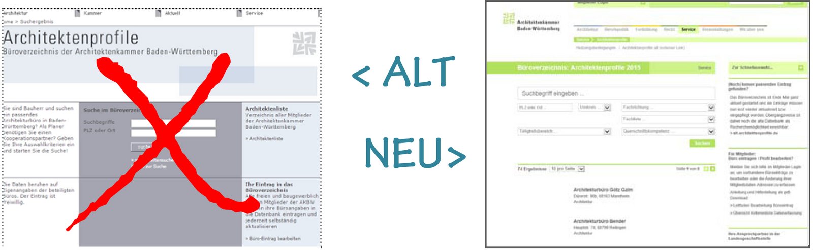Nach einer grundlegenden Überarbeitung ist das Büroverzeichnis vollständig in den Internetauftritt der Architektenkammer Baden-Württemberg integriert und durch aktuelle Techniken direkt mit der zentralen Adressverwaltung verknüpft. Die Fachrichtungs- und Fachlisteneinträge aller im Büro tätigen Kammermitglieder erscheinen jetzt in den Architektenprofilen mit der Folge, dass sich der Gesamtumfang der im betreffenden Büro angebotenen Kompetenzen automatisch, insbesondere auch durch die angestellten Mitglieder, erhöht. Neu implementiert ist die Möglichkeit, in beliebiger Zahl Wettbewerbserfolge und Auszeichnungen bzw. Referenzobjekte – jeweils mit Bild und verweisendem Link – anzugeben. Dadurch wird die Detailansicht des Büroeintrags zur aussagekräftigen und ansprechenden Visitenkarte. Alle Angaben zum Büro sowie sämtliches Bildmaterial und externe Links können die Büroinhaber oder -inhaberinnen selbst eingeben und aktualisieren. So lässt sich das Büroprofil jederzeit auf dem neuesten Stand halten.