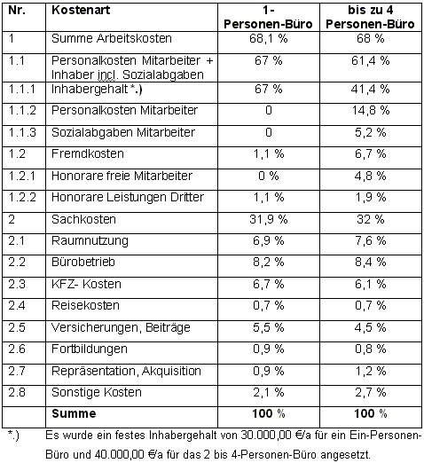 Eine differenziertere Betrachtung der Kostenstruktur eines Architekturbüros kann ebenfalls den o. g. Untersuchungen entnommen werden. Das nachfolgende Beispiel entstammt der Untersuchung in Baden-Württemberg von 2006 und listet die arithmetischen Mittel für Ein-Personen- und 2 bis 4-Personen-Büros auf.