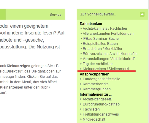 Sie sind auf der Suche nach einem neuen Arbeitsplatz oder einem geeignetem Mitarbeiter? Sie möchten eine Anzeige aufgeben oder vorhandene Inserate lesen? Auf unserer Plattform „Kleinanzeigen“ finden Sie Stellenangebote und –gesuche, Praktikumsplätze, Kooperationsmöglichkeiten oder Büroausstattung. Die Nutzung ist kostenlos.