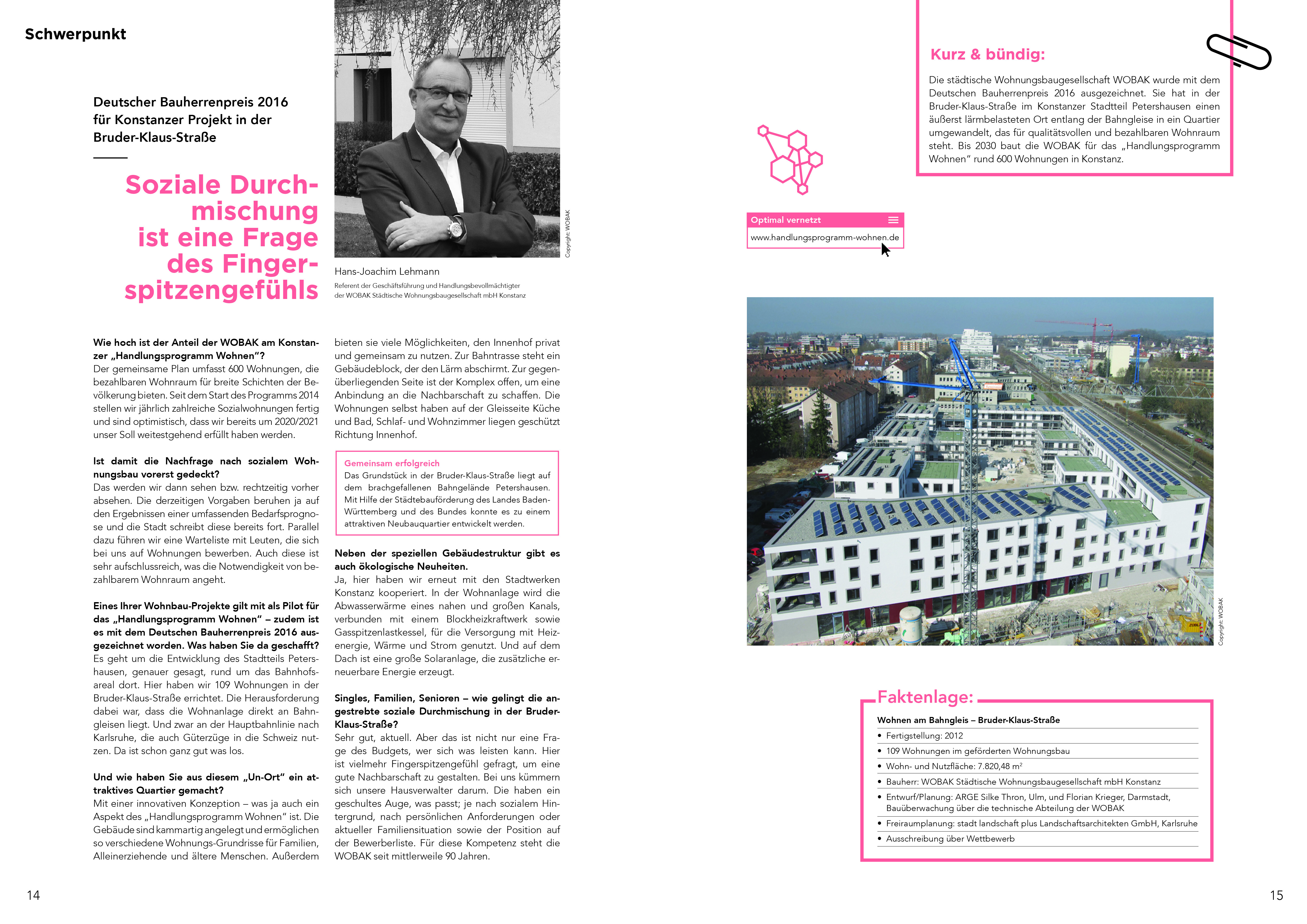 "Wir brauchen in der Wohnungsbaudebatte eine differenzierte Diskussion. Dazu leistet KONZEPT einen wichtigen Beitrag", sagt Markus Müller, Präsident der Architektenkammer Baden-Württemberg. Das dreimal pro Jahr erscheinende Heft stellt Beispiele für zukunftsorientierte Wohnformen in den Fokus. Sie sollen Kommunen und anderen Wohnbaupartnern zur Inspiration dienen. Die Erstausgabe, die pünktlich zur Sitzung der Wohnraum-Allianz am 8. Mai 2017 vorliegt, hat "Kommunale Beispiele mit Zukunft" zum Schwerpunkt.