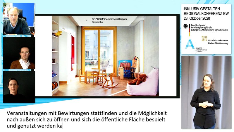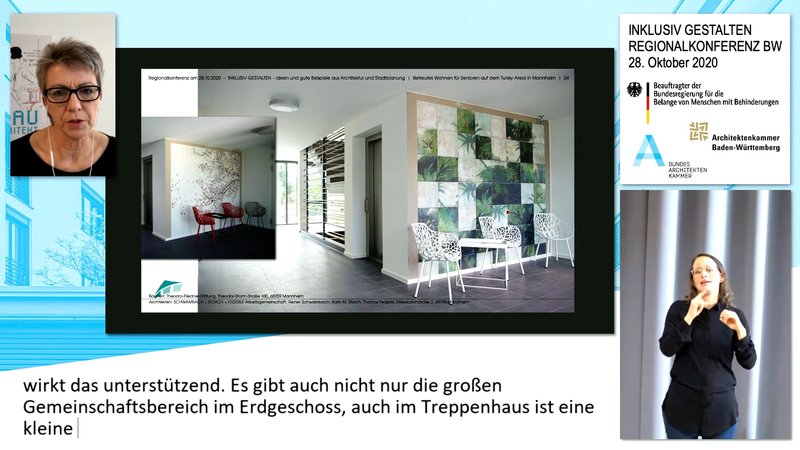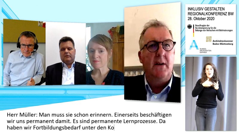 Barrierefreies Bauen ist kein exklusives Thema für Menschen mit Handicap, sondern geeignet, den Zusammenhalt unserer vielfältigen Gesellschaft insgesamt zu organisieren. Eine gefestigte Demokratie braucht die Inklusion vieler unterschiedlicher Menschen und Gruppen. Unsere Best Practice-Beispiele aus Mannheim, Tübingen oder Leonberg zeigen: Gut durchdachtes Planen und Bauen hat die Kraft, Gemeinschaft herzustellen", sagte Markus Müller, Präsident der Architektenkammer Baden-Württemberg. "Unsere erste digitale Inklusionskonferenz mit Gebärdenübersetzung ist ein Musterbeispiel für barrierearme Kommunikation."