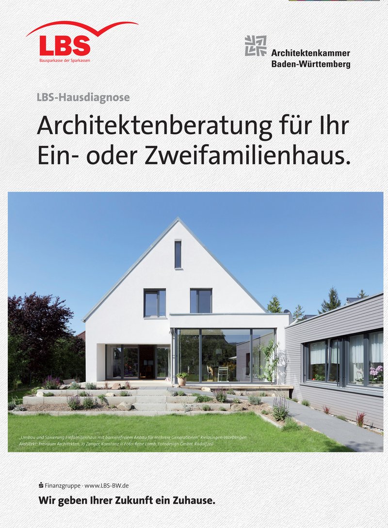 Die Landesbausparkasse Baden-Württemberg LBS bietet seit 2012 wieder die „Hausdiagnose“ ihren Kunden an. Als Kooperationspartner der LBS sucht die Architektenkammer Baden-Württemberg freie Architektinnen und Innenarchitekten, die Beratungen zur Bestandssanierung und Modernisierungen von Wohngebäuden anbieten. Die Aktion ist für mehrere Jahre geplant. Wichtig: Die Unterlagen sind weiterhin gültig, selbst wenn das angegebene Datum überschritten ist!