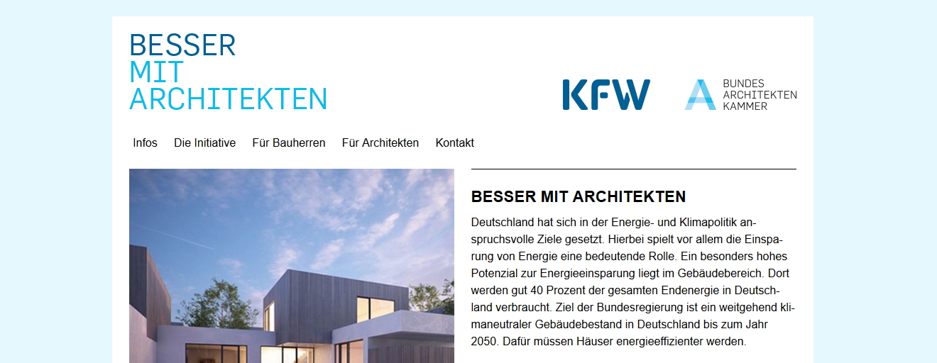 Auf dieser Website bieten die BAK und die KfW ein Informationsportal, das sich an Architekten sowie an Bauherren wendet. Architekten erhalten Informationen über die Förderangebote der KfW. Außerdem erhalten Sie Auskunft über die Eintragungsvoraussetzungen zur Expertenliste für Förderprogramme des Bundes. Bauherren sollen mit der Website für das Thema „Energieeffizientes Bauen und Sanieren“ sensibilisiert und über die Vorzüge einer Begleitung durch Architekten aufgeklärt werden.